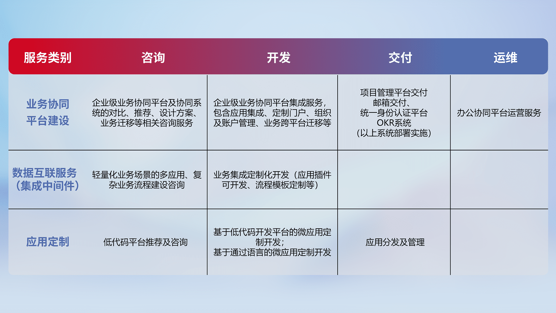 针对钉钉、、企微、、、、IDaas等平台级产品提供产品的规划、、方案、、、、交付、、、定制化开发等服务,,,,实现如统一协同办公、、、、智能客户服务、、、、混合会议管理、、、智能数据查询、、、等业务场景,,,,实现数字化转型。。。